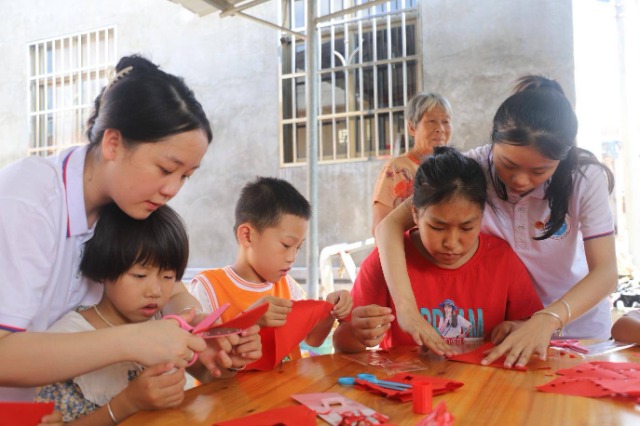 该校儿童艺术学院党史学习教育团的成员们利用专业优势,在合浦县常乐镇大教村与当地留守少年儿童开展剪纸活动,与孩子们一同感受“非遗”文化的魅力,在孩子们心里播下传统艺术的种子。团队成员详细教学剪纸的技巧与方法,一张张精美的剪纸作品让小朋友们开心不已。